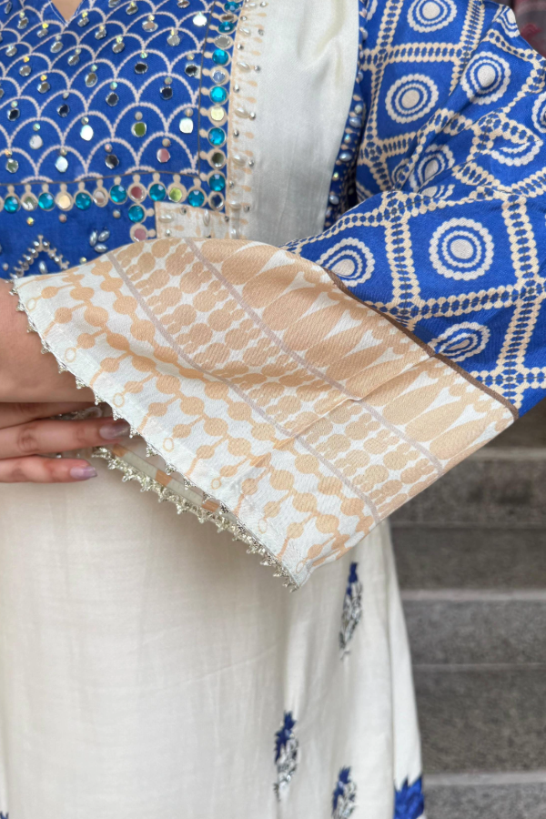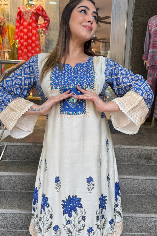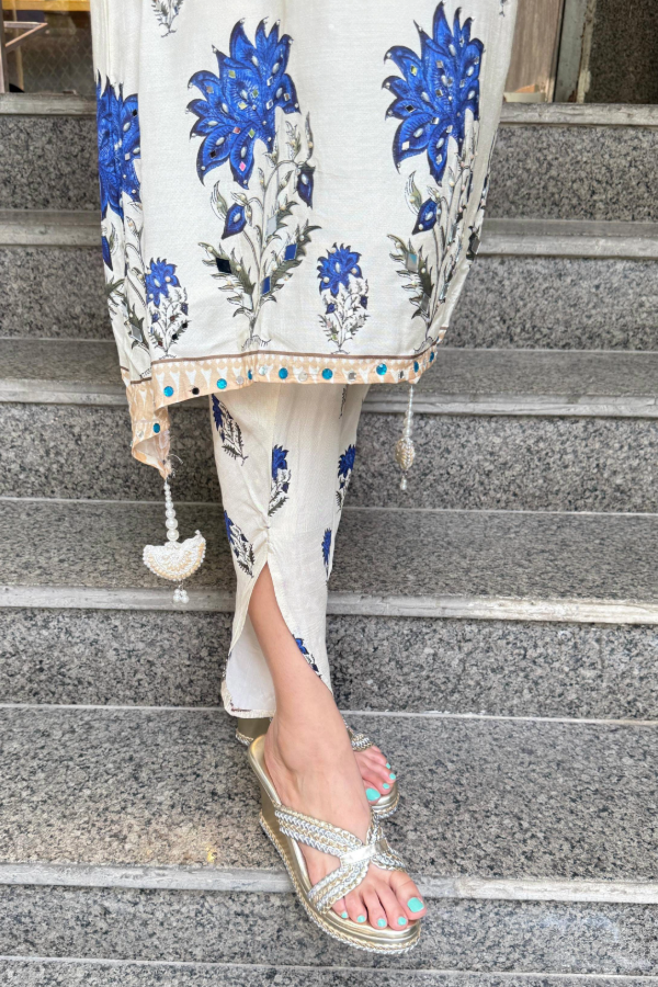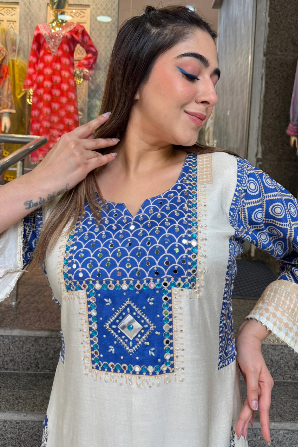 Premium quality coord set with hand block print adorned with real mirror studded hand embroidery, paired with stylish tulip pants…