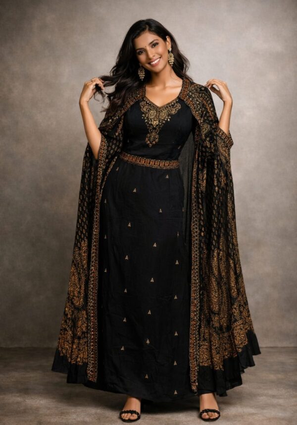 This elegant two-piece set is crafted from 100% pure natural crepe, offering a seamless blend of comfort and sophisticated drape. The coordinated kurti and shrug pairing features a soft, pebbled texture and a fluid silhouette that transitions effortlessly from day to evening.