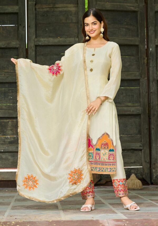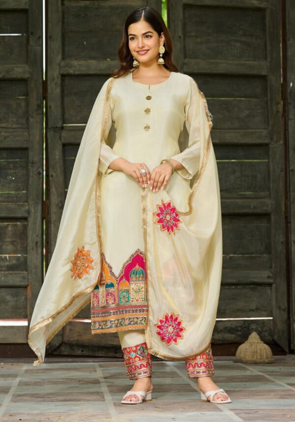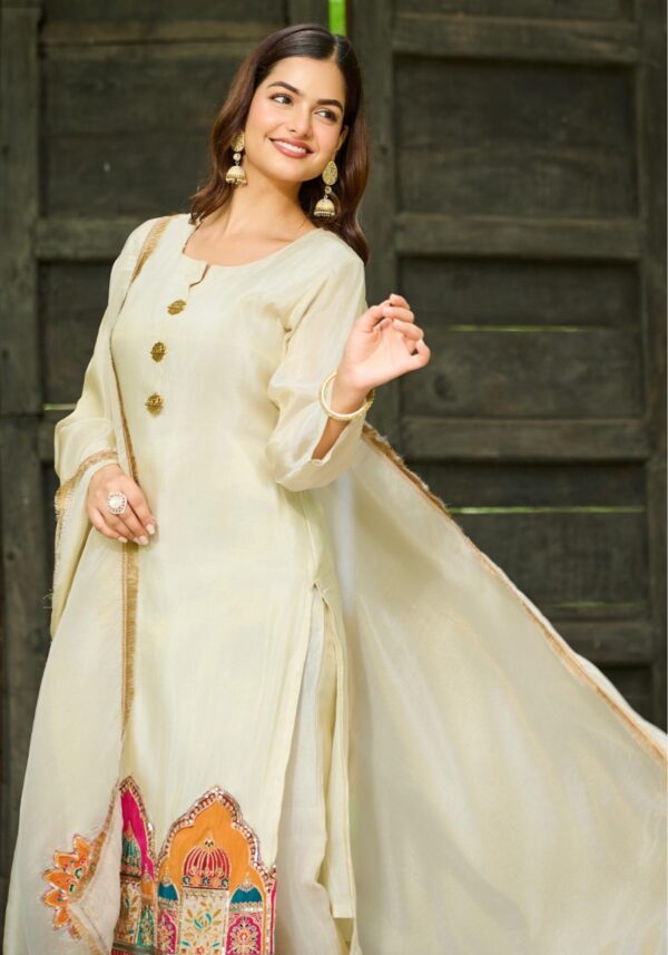 The look is completed with pure shimmer tissue bottoms and a matching tissue dupatta, both featuring detailed embroidery. To ensure you feel as good as you look, the set comes with a soft cotton inner for breathable comfort throughout the day.
