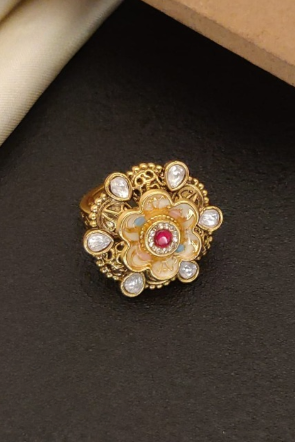High-quality adjustable ring showcasing exquisite Kundan work and sparkling semi-precious stone detailing.