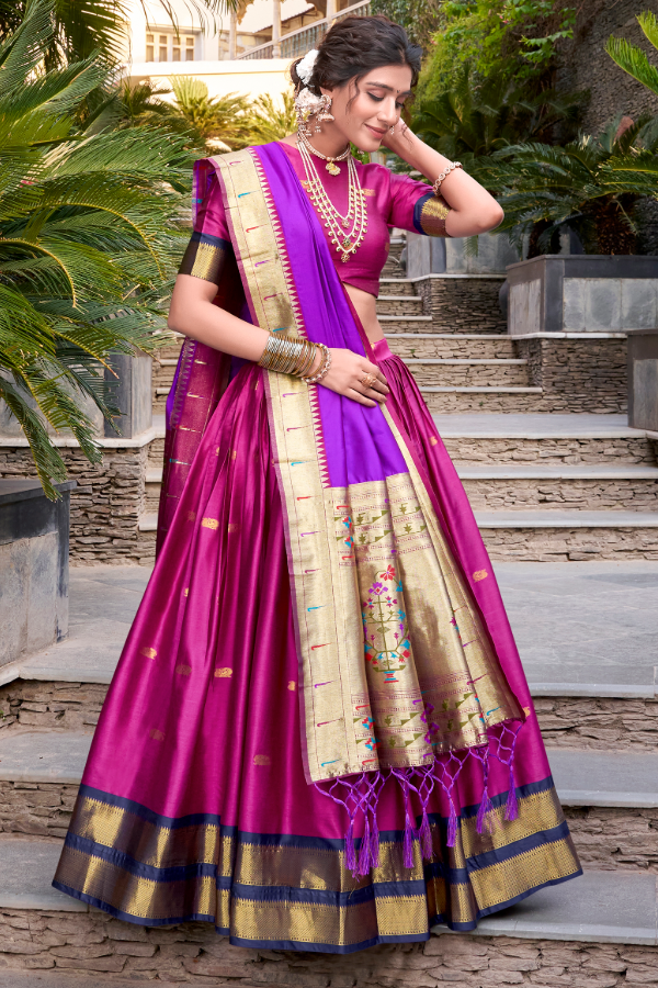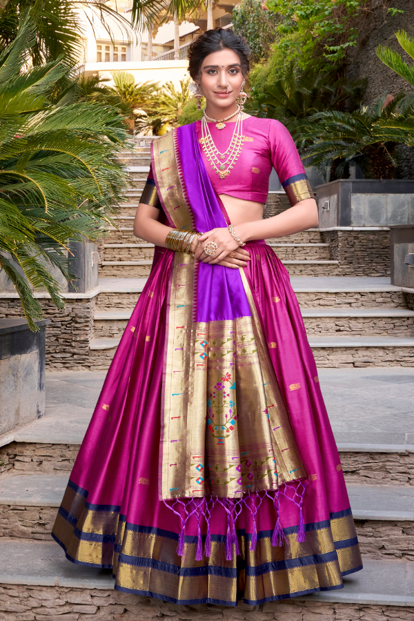 Shine in this premium Paithani Jacquard Silk Lehenga set. Inspired by Maharashtrian heritage, it features intricate Zari weaving and a regal glow—perfect for weddings, festivals, and grand celebrations.