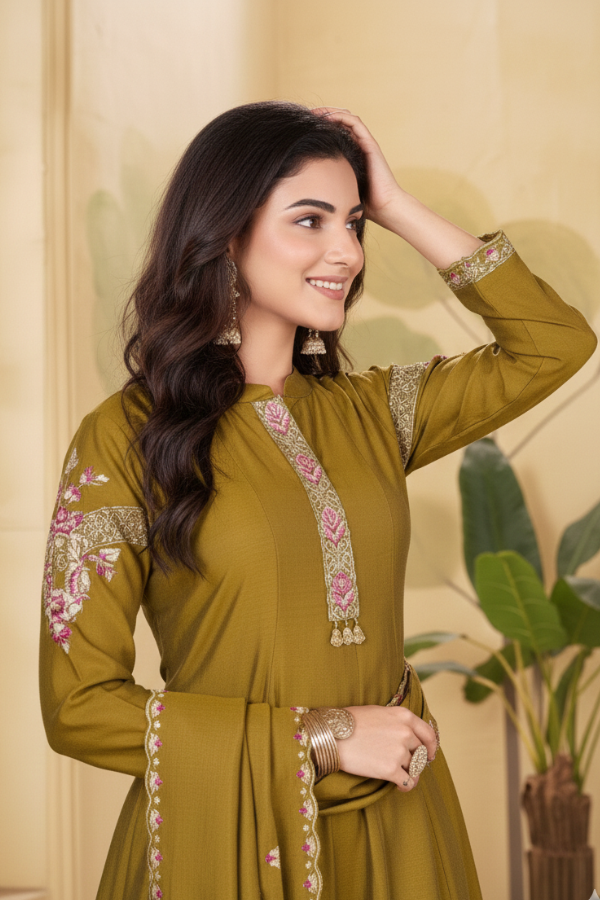 Intricately hand-embroidered Anarkali-cut piece, embodying traditional elegance.