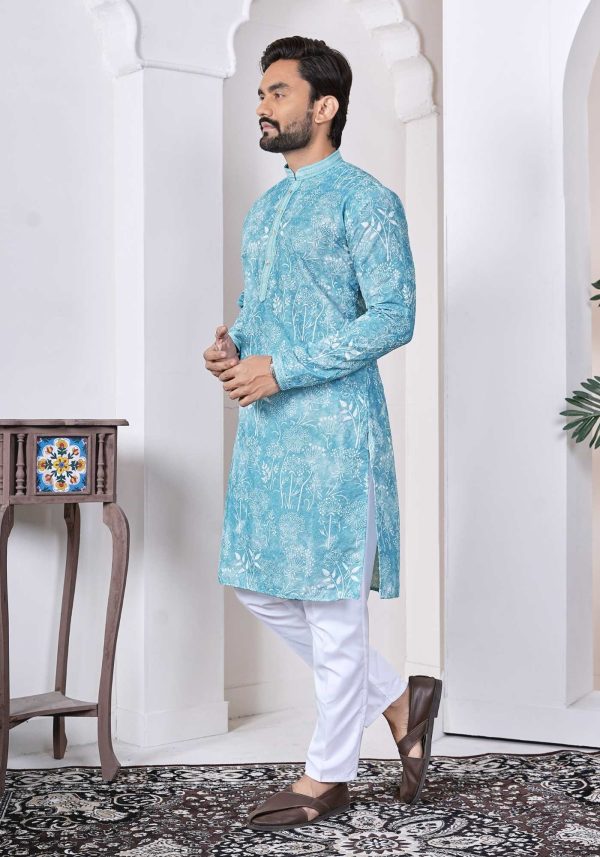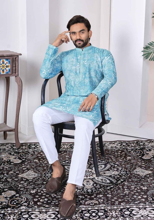 Redefine your ethnic wardrobe with this cotton long kurta featuring intricate Lucknowi work and extraordinary digital prints. This regal ensemble is finished with a silk-thread neck design and paired with matching cotton pajama pants.