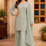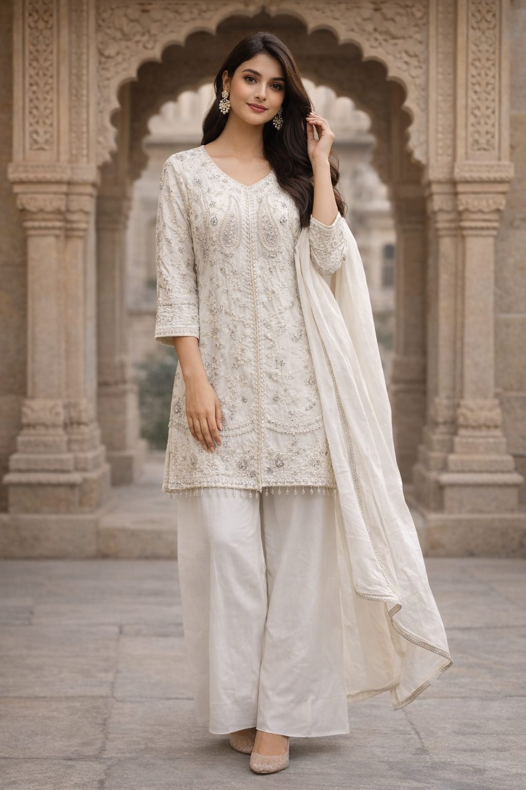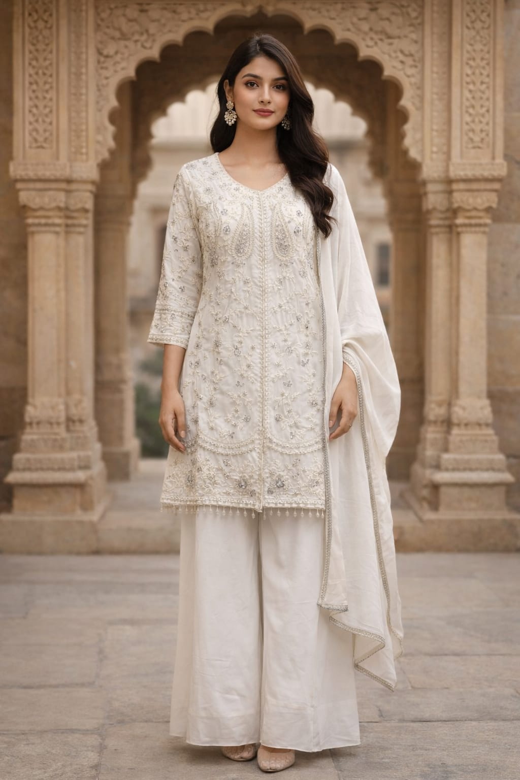 This ensemble features an elegant pure georgette kurta intricately detailed with paisley beadwork and delicate silver-lace accents. Designed as a complete three-piece set, it pairs a flowing palazzo with a matching shawl for a seamless, high-end silhouette.