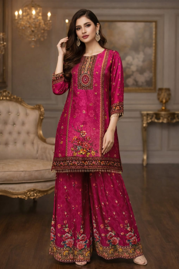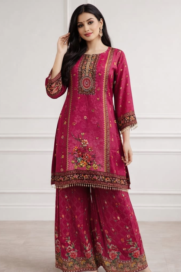 Designed for the modern woman, this Pure Crepe ensemble merges high-end luxury with effortless comfort. Renowned for its signature pebbled texture and fluid drape, this versatile Top, Bottom, and shawl set offers a sophisticated silhouette perfect for festive celebrations or formal occasions.