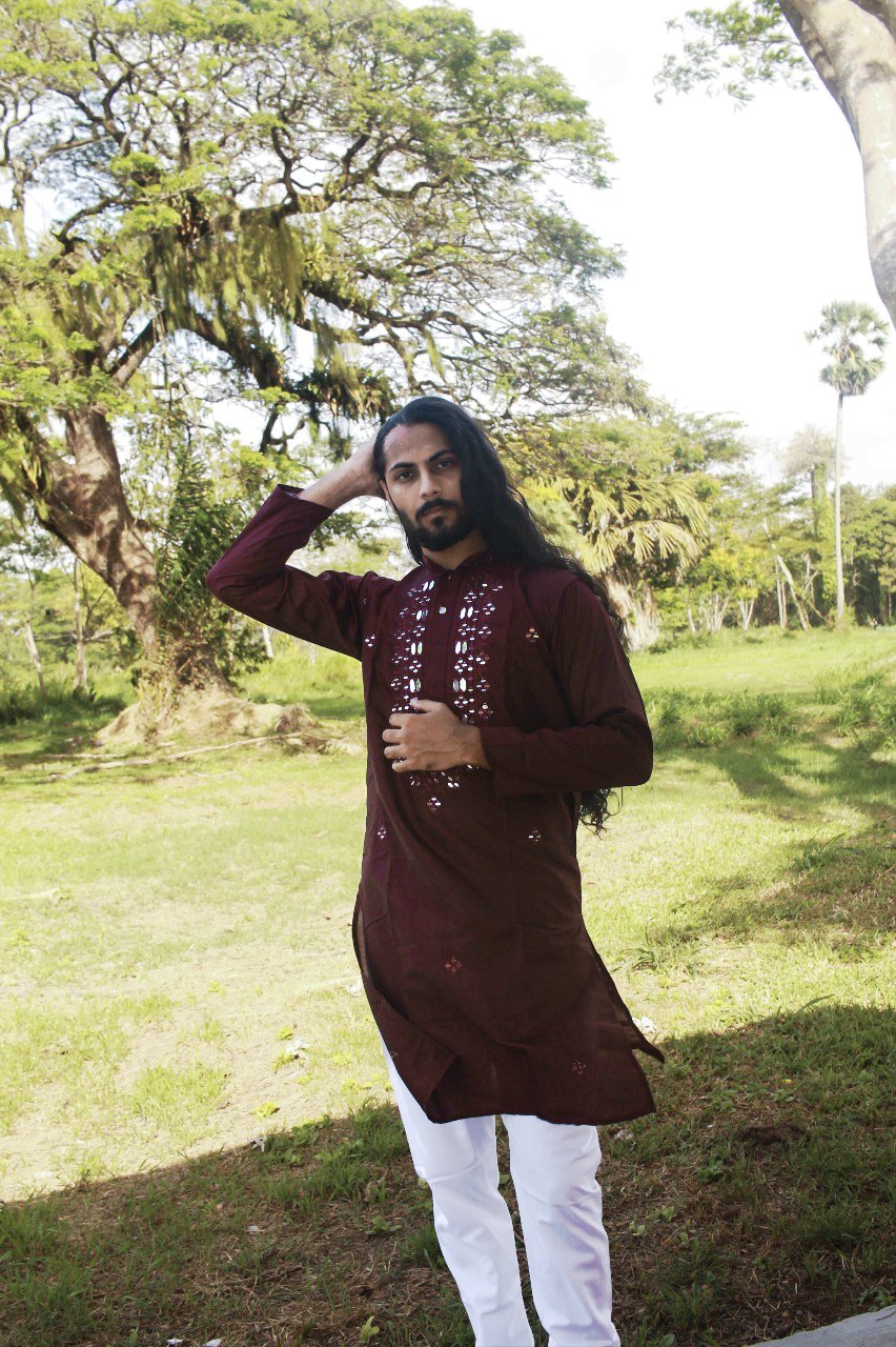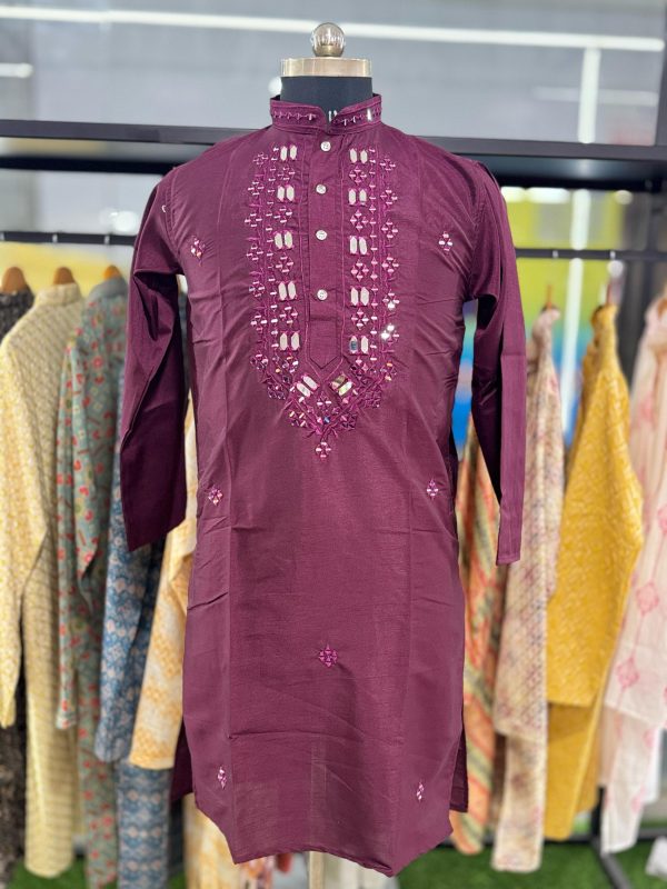 A silk touch kurta pajama in plum shade and real mirror studded hand embroidery! Comfy and Classy indeed!!