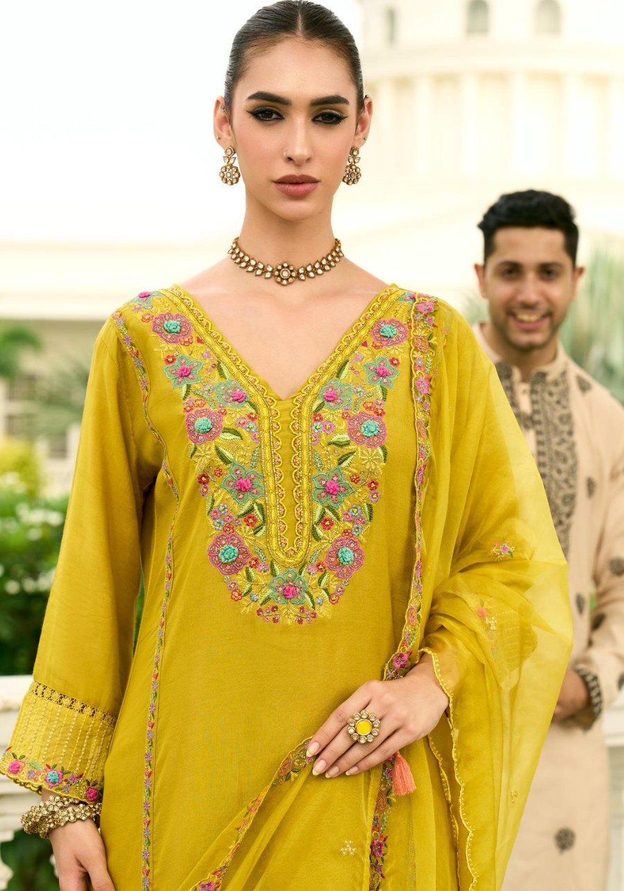 Step into a world of refined elegance with our pure mull chanderi hand work collection. This ensemble is a celebration of traditional craftsmanship blended with modern silhouettes, perfect for festive gatherings and special occasions.