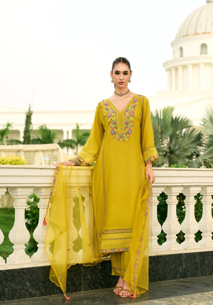 Sunshine Chanderi Ethnic Set With Intricate Cut-Work Shawl