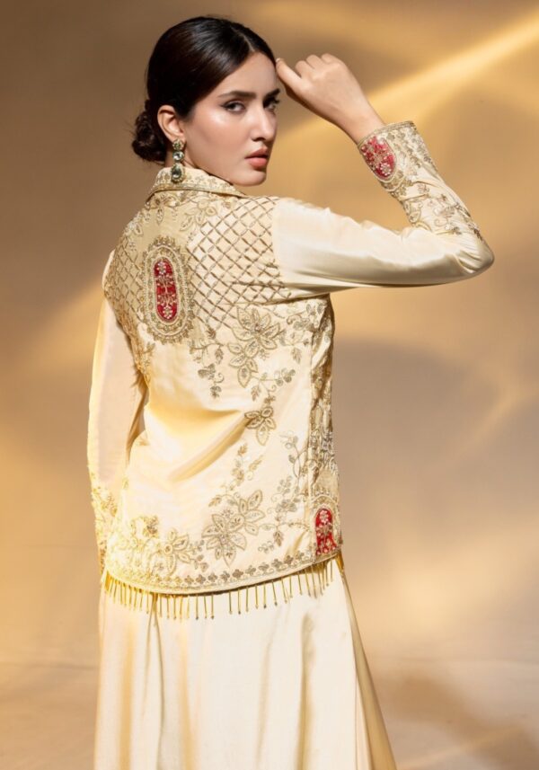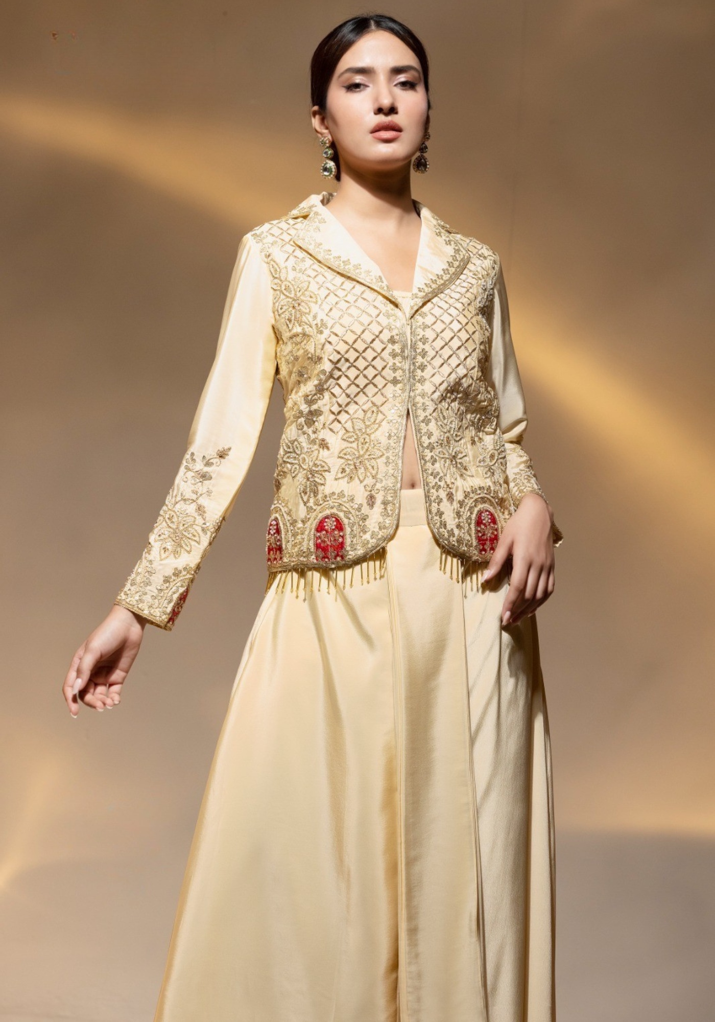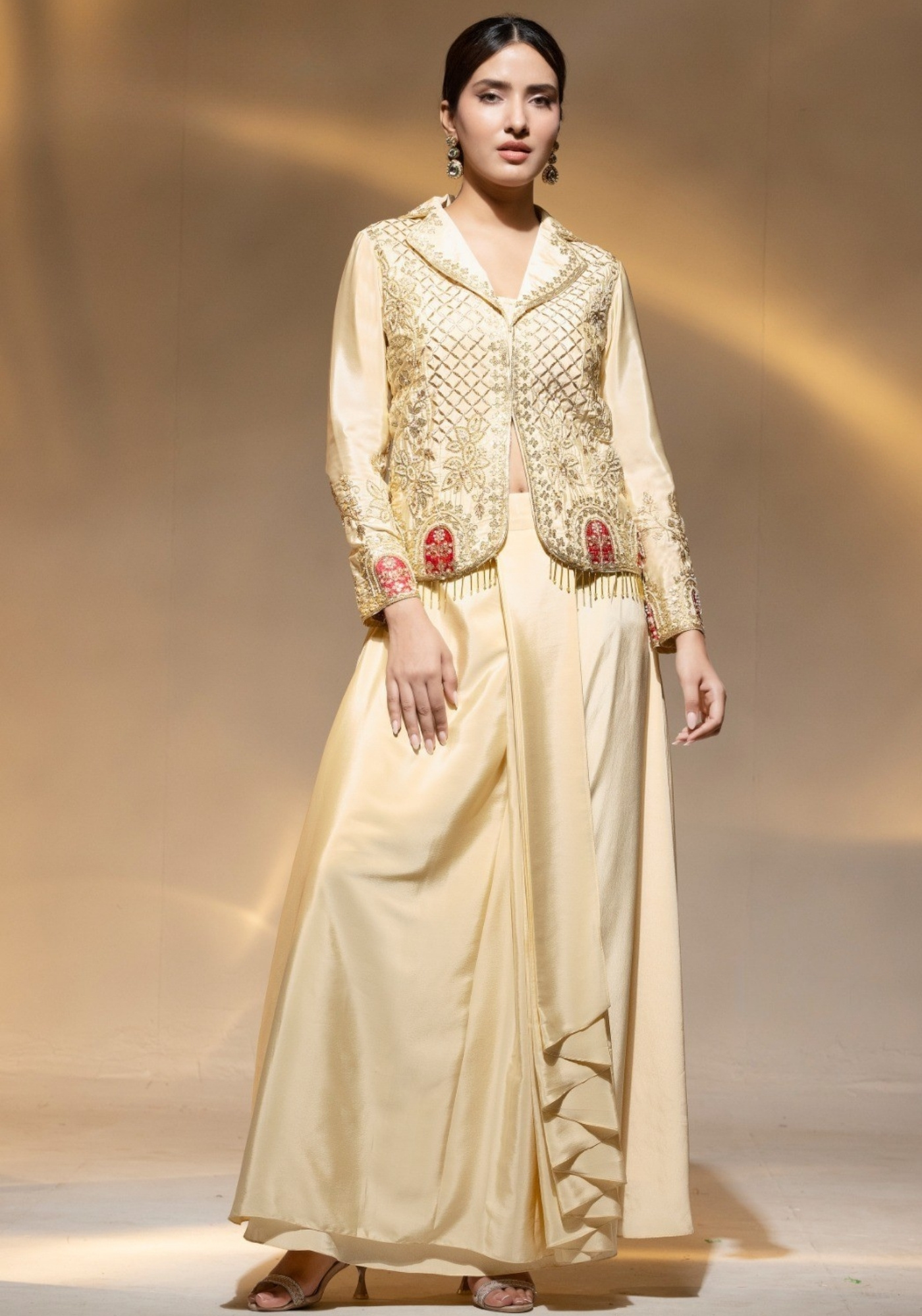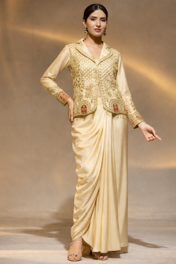 This premium crape ensemble features an elegant collar top with intricate front-back beadwork paired with a sophisticated cowl-draped skirt. The integrated pants and fluid silhouette perfectly balance high-fashion luxury with effortless comfort.