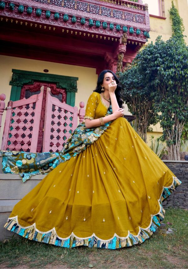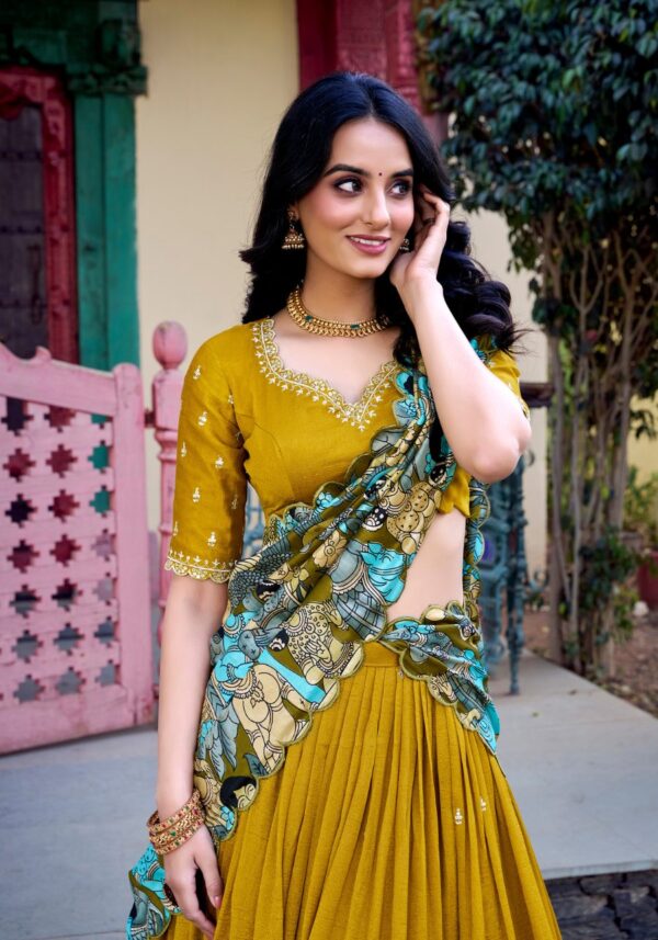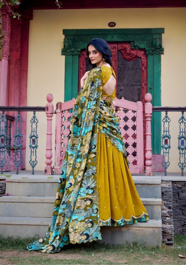 This mustard lehenga features signature scalloped edges and a bold teal folk-art shawl. Its artisanal vibrant, curved detailing make it a perfect statement piece for daytime festivities.