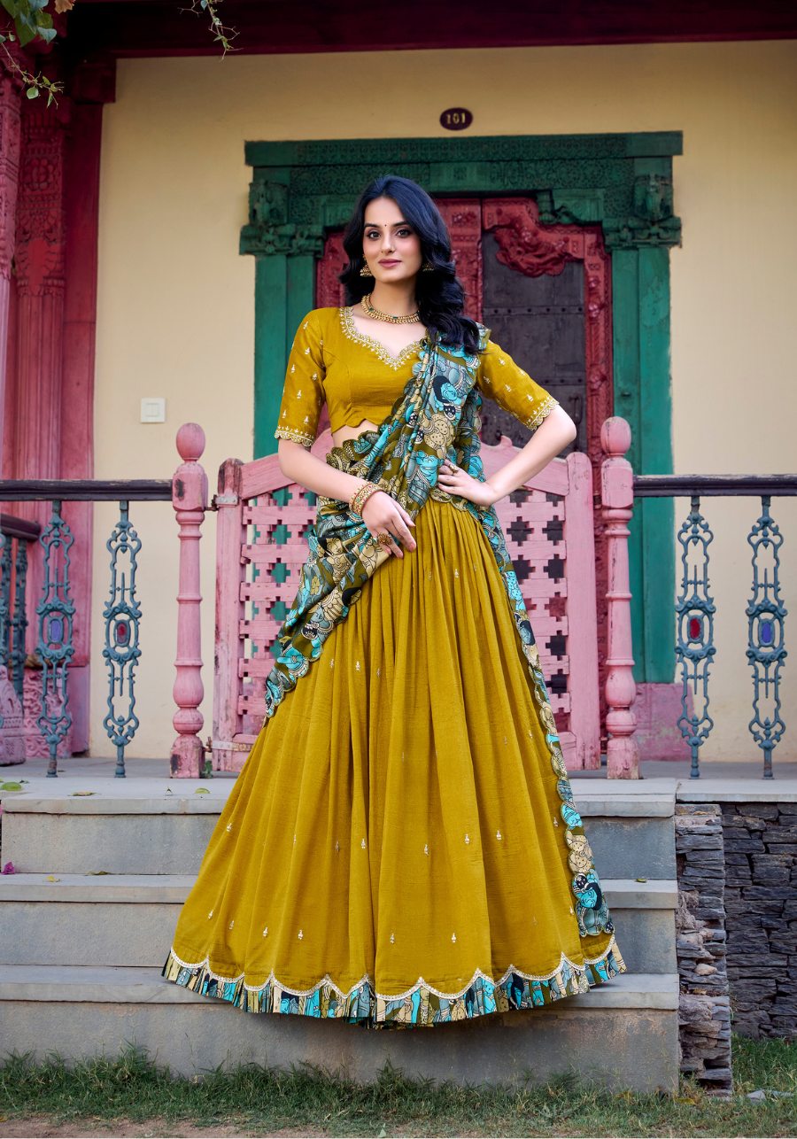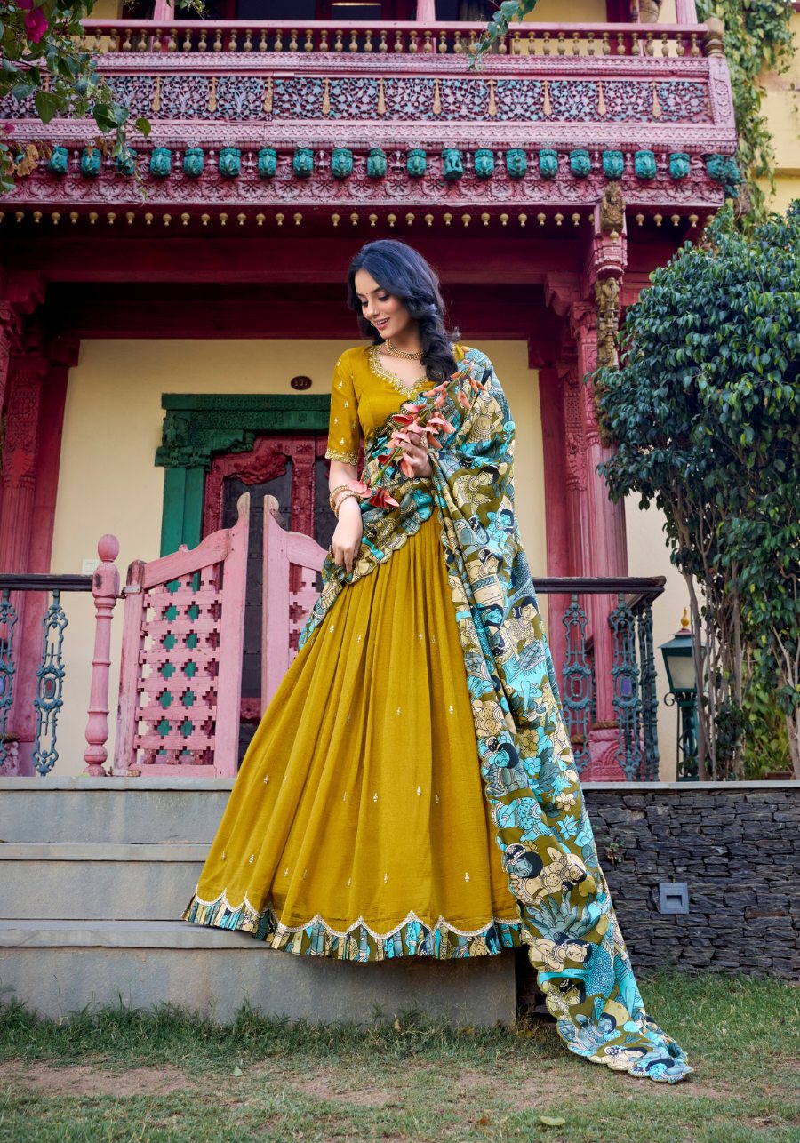 This mustard lehenga features signature scalloped edges and a bold teal folk-art shawl. Its artisanal vibrant, curved detailing make it a perfect statement piece for daytime festivities.