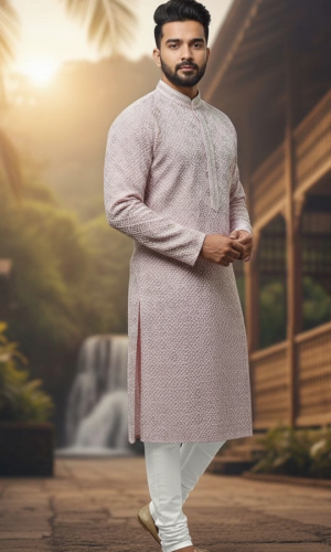 Luxurious Embroidered Kurta Pajama for Men in Nobel Pink(Comes with White Pants/Pajama)