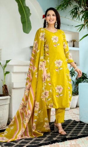 Mustard Hand-Detailed Mustard Floral Ensemble in Pure Cotton